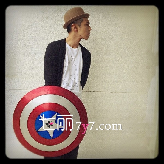 白色字母T恤外搭黑色开衫,搭配着黑色休闲裤。带着一顶卡其色帽子非常帅气,酷劲十足。爱搞怪的他手拿美国队长的盾牌,这是要干嘛?