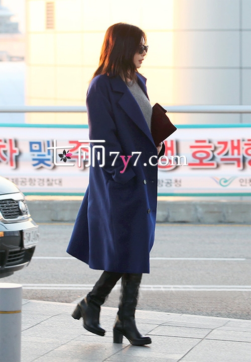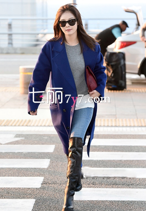 近日,4Minute组合成员金泫雅独自一人现身韩国某机场,准备飞往香港参加品牌活动。身穿宝蓝色长款呢子大衣外套,简约时尚的款式,经典双排扣及翻领设计,帅气又不乏优雅感,宽松的版型,更具迷人气场。内搭灰色短款毛衣,露出白色衣摆,为造型增添层次感。简单的搭配上浅色牛仔裤,休闲范儿十足,一双黑色过膝长靴的加入,形成超有型混搭风格,尽显大气御姐范儿。用酒红色手包凹造型,使整体造型看上更妩媚慵懒。