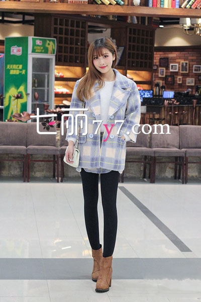 格子毛呢外套,清新淡雅的色彩,让人眼前一亮,将MM的气质衬托得温婉柔和,大翻领、双排扣多个经典设计融合,美翻了。内搭白色打底衫,下穿黑色高腰紧身裤和高跟短靴,挎上链条小包,淑女装扮轻松赢得异性缘。