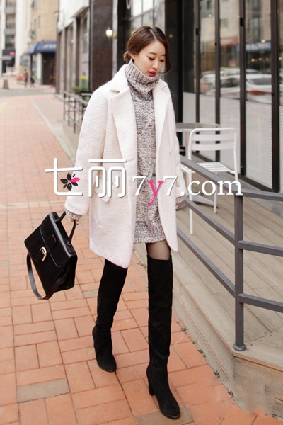 白色呢子大衣,奶油色典很是温柔纯美,经典的廓形款式,也很时髦有型。内搭灰色高领毛衣裙,配上一双过膝长筒靴,尽显优雅魅力,拎着黑色手包,如此高雅有型的装扮,怎么能不爱呢?