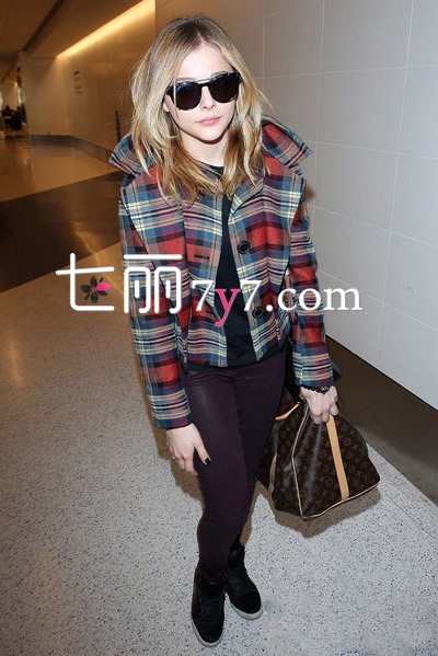 经典的格纹元素短款外套,蓝色与蓝色的相撞,展现复古格调,极具设计感的衣领,帅气又有型,内搭黑色打底衫,下穿黑紧身裤和休闲鞋,潮范儿尽显,简约却不简单。黑色墨镜和大包,都酷劲十足。