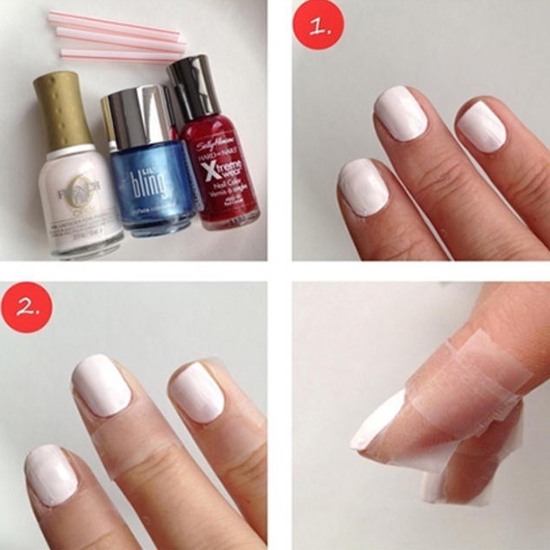 STEP1:三瓶不同颜色的指甲油,要干净一点可以用白色做底色。再准备三段吸管和一些胶带。用白色作为底色,涂完十指并晾干。