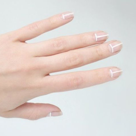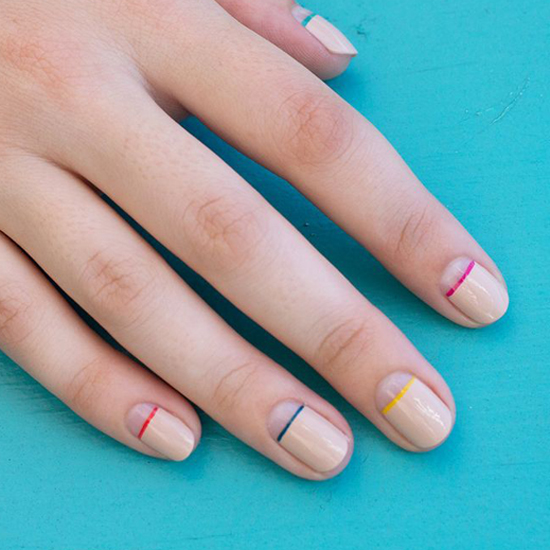 这两款美甲,都是使用的线条,只是线条不再是竖线了,而是极细的横线,改变了我们习惯了的竖线感觉,可以说是极简主义美甲图案,第一款只是涂上了透明的底色,然后画上极细的白色线条,简单的美感爆棚了。第二款则是涂上了3/4的裸色,在交界处涂上了极细的糖果色线条,还有点甜甜的感觉呢。