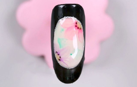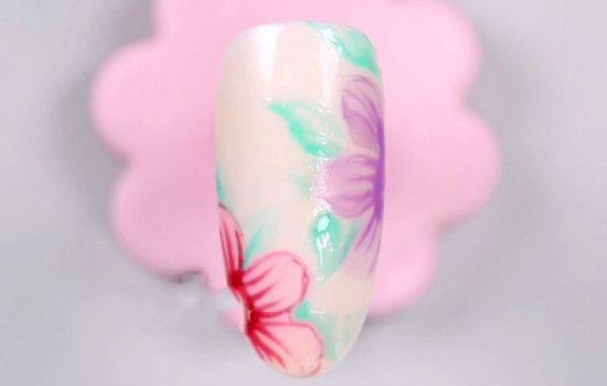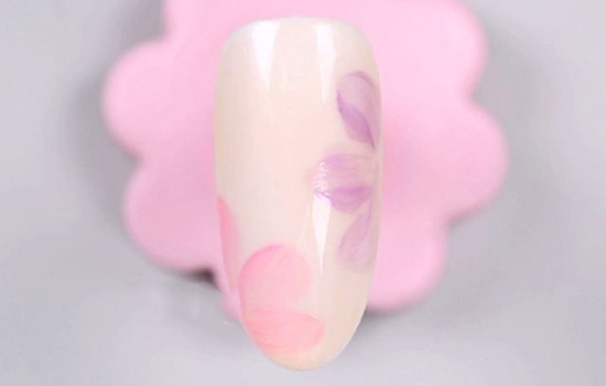 第十步:同样是先完成裸色甲面!用圆笔沾取紫色甲油胶,在甲面的右边画出宽扁的花瓣,让三片花瓣组合成一朵花儿~用一样的方法,画出粉红色的花朵。