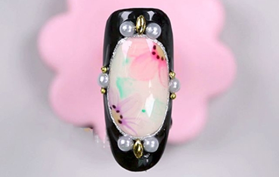 第九步:用小笔沾取光疗胶,刷在椭圆的边边,然后把珍珠和钻饰粘上去装饰甲面,照灯。最后再刷上一层封层,这个甲面就完成啦~