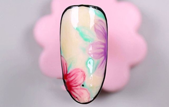 第十一步:用小笔沾取和花朵一样的颜色,画出花芯之后往花瓣的末端拉出线条,使它成为花瓣的纹理,如果甲油胶不够多可以再沾取一点哦!粉红色的花朵有点不一样~花芯用黄色甲油胶画,然后用小笔沾取玫红色甲油胶,围着花芯绕半圈之后,拉出花瓣的纹理。同时还要稍稍描绘下花瓣的纹理哦!接着用小笔沾取调稀了的绿色彩绘胶,大致的画出绿叶的形状。颜色比较深的位置,彩绘胶要多沾一点啦~照灯。