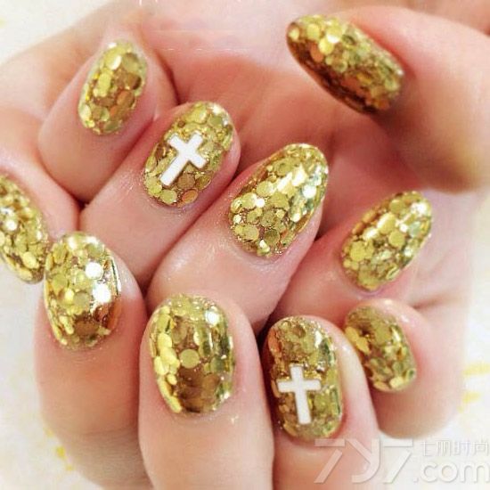 纯亮片黄金色甲油打造,中间凸显十字图案,也是为了不单调!