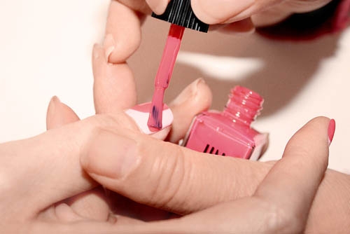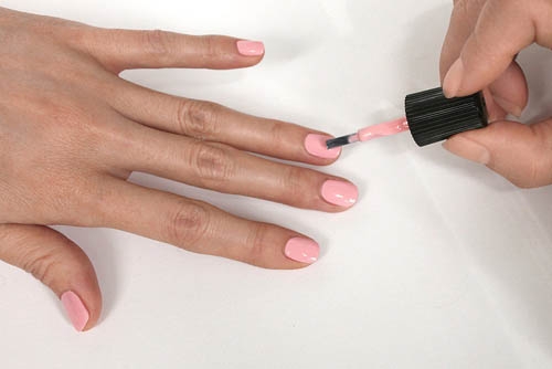 STEP 2:待透明指甲油干燥后,涂上淡粉色指甲油。