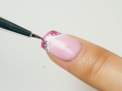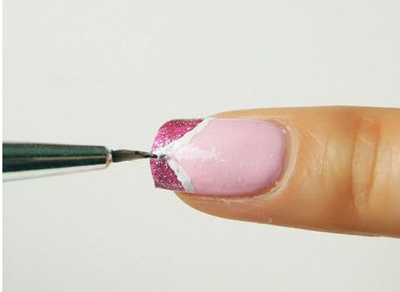 Step 4:用白色指甲油在香芋紫和深紫色甲油的交界处画出白色V边。