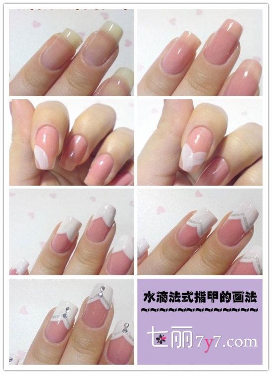 水滴形状的指甲看上去会比较浪漫优雅,在很多装饰物和首饰都运用到了水滴的元素,那么今天就来教大家一种简单的水滴式法式美甲,超级淑女的呢。