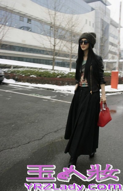 小编点评:范冰冰用一袭黑的装扮,黑色皮衣,灰色打底衫,下搭黑色飘逸感长裙,高跟短靴,大大的墨镜,皮草帽,时尚大气的女王范。