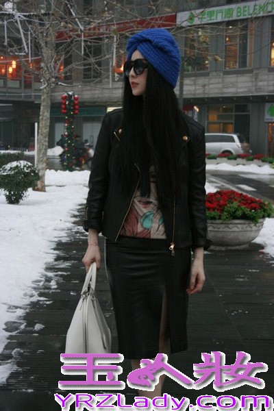 小编点评:宝蓝色的针织帽子,头巾式的造型,搭配黑色皮衣,高开叉过膝长裙,相当的潮呢,明星范儿十足,但是这样穿着更适合室内哦。