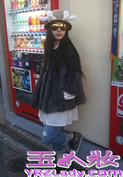 小编点评:鹿角造型的可爱毛呢帽子,搭配灰色皮草外套,下搭破洞卷边裤,亮片材质的系带厚底鞋,休闲的装扮中透露可爱呢。