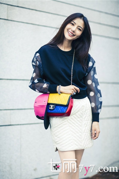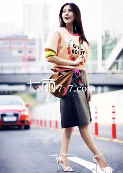 高圆圆卫衣+高腰裙搭配LOOK2