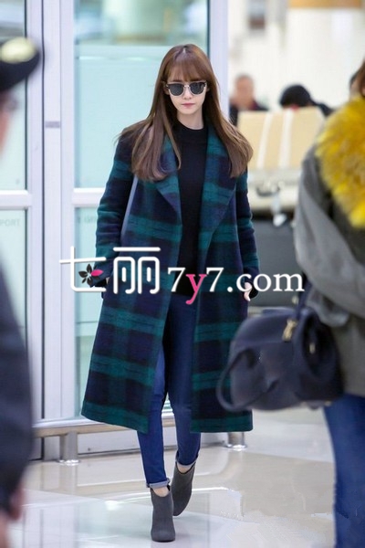 搭配要点:超长款的格纹大衣是今年超流行的款式,允儿穿上很随性的Feel,可以遮盖住肚子和大腿上的肉肉,露出最纤细的脚踝的位置,记住内搭一定要短款上衣和高腰裤,打造出完美的曲线。
