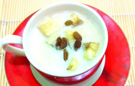 材料:生燕麦片100克,牛奶1袋,香蕉1根,葡萄干10克。