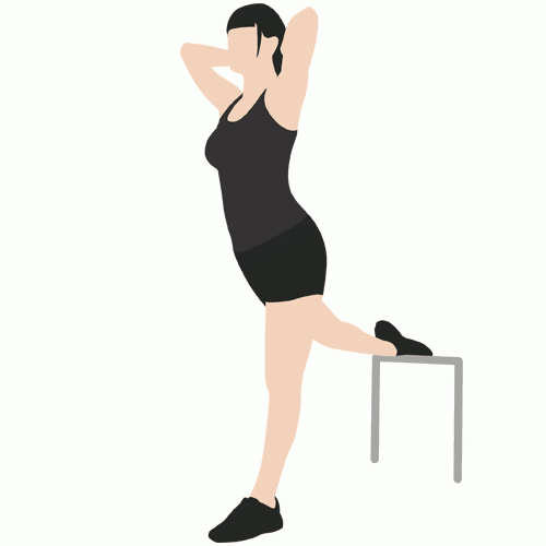 (1)背向健身凳站立,单腿着地,另一条腿置于凳上,抬头挺胸,腰腹收紧,双手抱头;