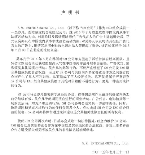 7月31日,韩国SM公司再次发布声明,称会采取一切法律措施,以全力维护SM公司、EXO组合以及其他善意合作方在中国以及其他地区的合法权益。