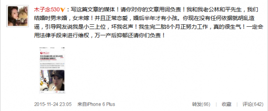 李念因出演电视剧《蜗居》中饰演海藻走红,随后与金融才俊林和平结婚,生下了一男一女两个宝宝,与老公经常在微博上秀恩爱,被网友批炫富。就此还有媒体扒出李念老公和前妻离婚内幕,并称李念是小三上位,昨晚,李念在微博晒出某媒体的新闻截图,怒斥媒体造谣,否认自己是小三,将并称要用法律手段维护权利。