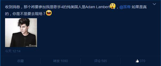 @灯灯HOHO:收到消息,那个将要参加我是歌手4的纯美国人是Adam Lambert,@耳帝 如果是真的,你是不是要去现场?