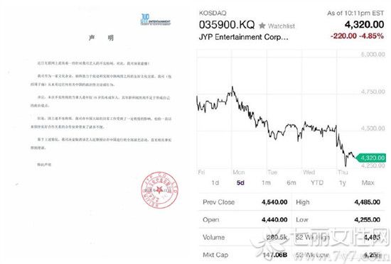 JYP回避了自身立场问题,对于周子瑜的言论解释为她是未成年人,并宣布取消周子瑜近期在内地的全部演艺活动,但危机公关的水平却把水搅得更浑了。这件事随之延烧到JYP旗下其他艺人,GOT7成员王嘉尔被取消了《天天向上》的录制行程,后续资源可能也会受到影响。今日,JYP股票更是暴跌,市值蒸发65亿韩元,后续情况十分堪忧。
