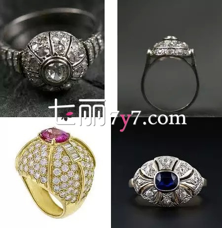 Bombé 是法语的隆起膨胀的意思,属于常见的豪镶款式。一般宽度比较宽,镶嵌成鼓起的弧形面。主石位于中心,对称展开的设计。