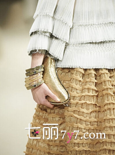 时尚点评:月牙般的土豪金手包,精致迷你,土豪节奏,高档华丽,侧面更有香奈儿的标志。