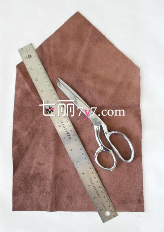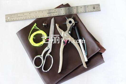 准备材料:皮革、绿色针线、打孔器、铆钉、剪刀、尺子、笔、暗扣