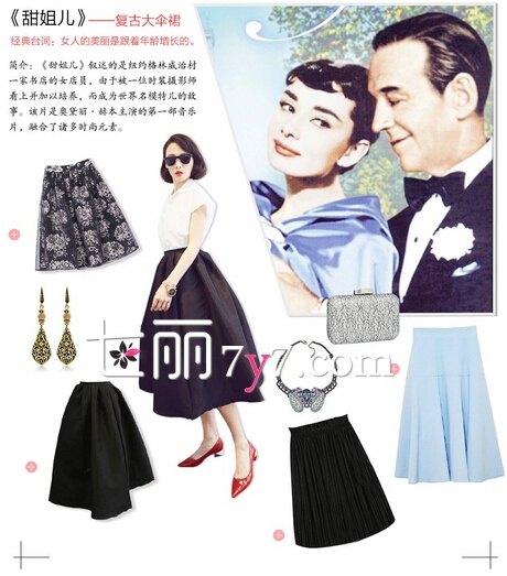 赫本每一部电影都能成就一种新时尚,在电影《甜姐儿》复古黑色大伞裙子,搭配手拿大理石纹路包包,配上白色的宽松衬衣,大气中彰显成熟女性的美。